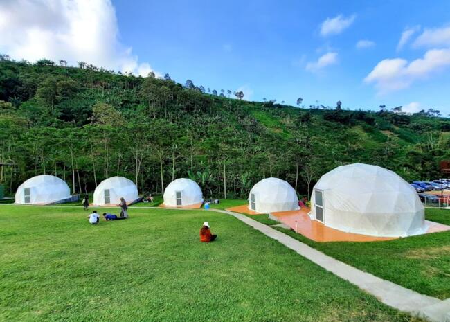 Berbentuk Dome atau setengah lingkarang dengan kapasitas 6 orang atau bisa di isi lebih dengan fasilitas 6 tempat tidur, bantal, selimut, stop kontak listrik, air bersih, toilet, water heater untuk membuat teh dan kopi panas. Jadi tak perlu takut akan kebutuhan selama menginap karena lembah indah sudah mempersiapkannya.